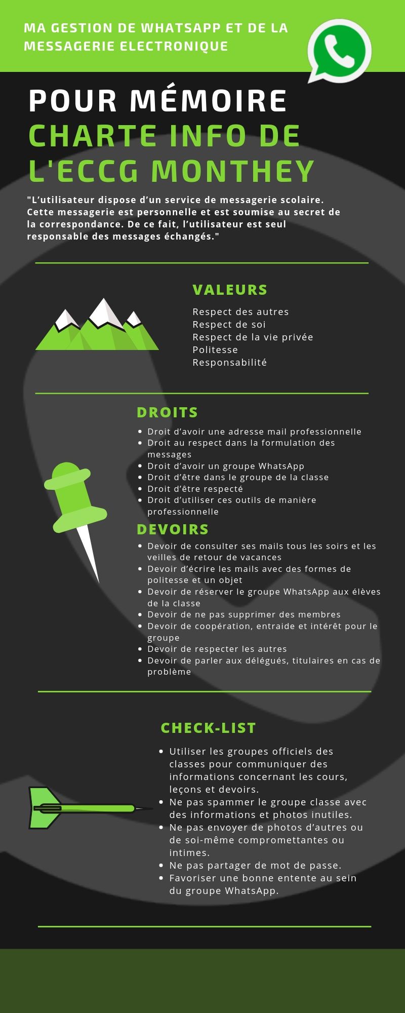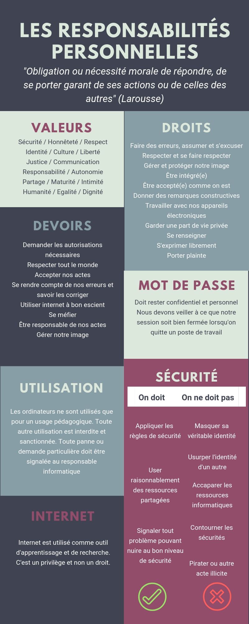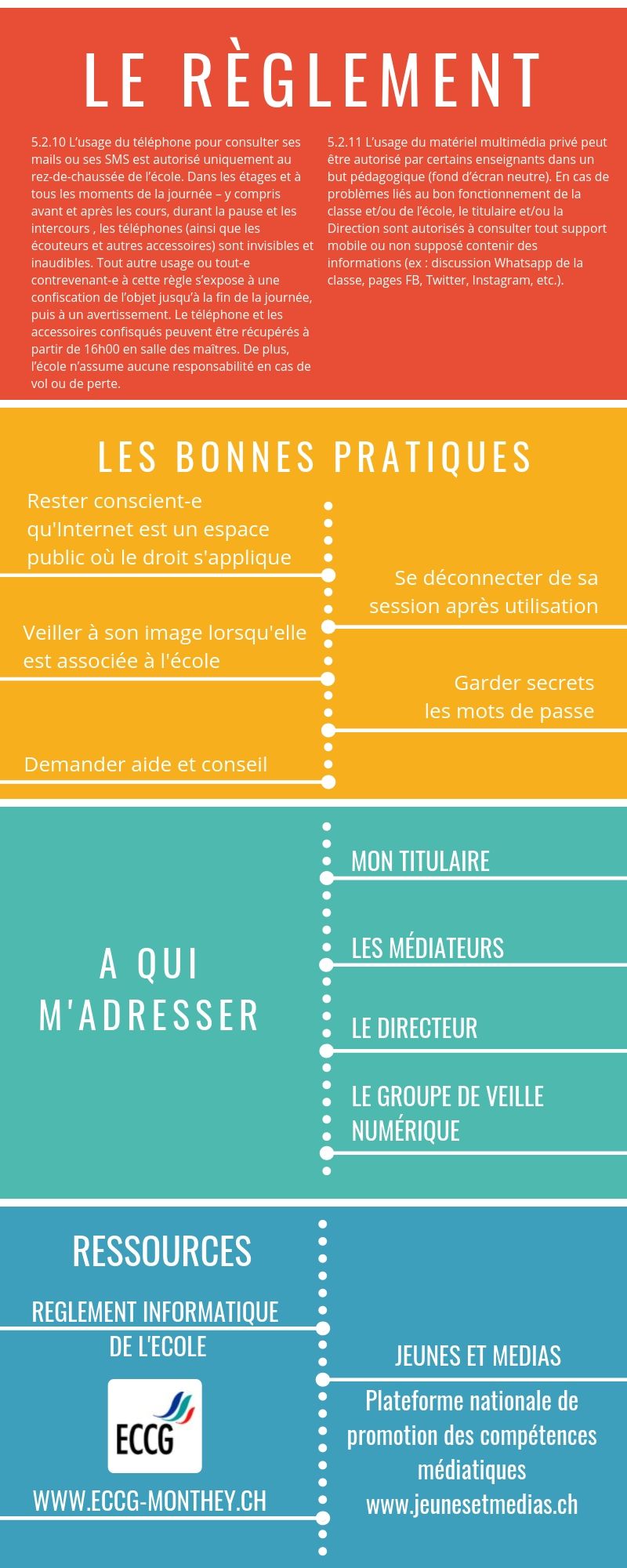 Par les élèves et pour les élèves! Les 6 flyers ci-dessous ont été pensés et rédigés par des classes d'éthique afin de permettre à tout un chacun de connaître ses droits et devoirs en matière de numérique à l'école. En accord avec le règlement de l'ECCG et la charte informatique de l'école (cliquez ici pour lire la version complète), ces petits guides sont regroupés par thèmes et fonctionnent comme ressources en cas de questionnement ou de difficulté. A consulter sans modération : Un clic sur l'image et le sésame s'ouvre de manière lisible :-)